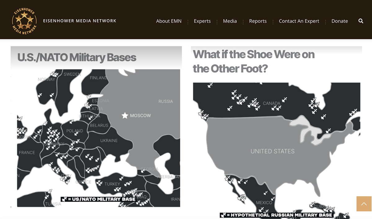 Pöördumise juures on kaardid, mis näitavad piltlikult, mis olukorras oleks USA, kui temaga piirnevates riikides oleksid samasugused sõjaväebaasid, mis on rajatud Venemaa naabrusse.